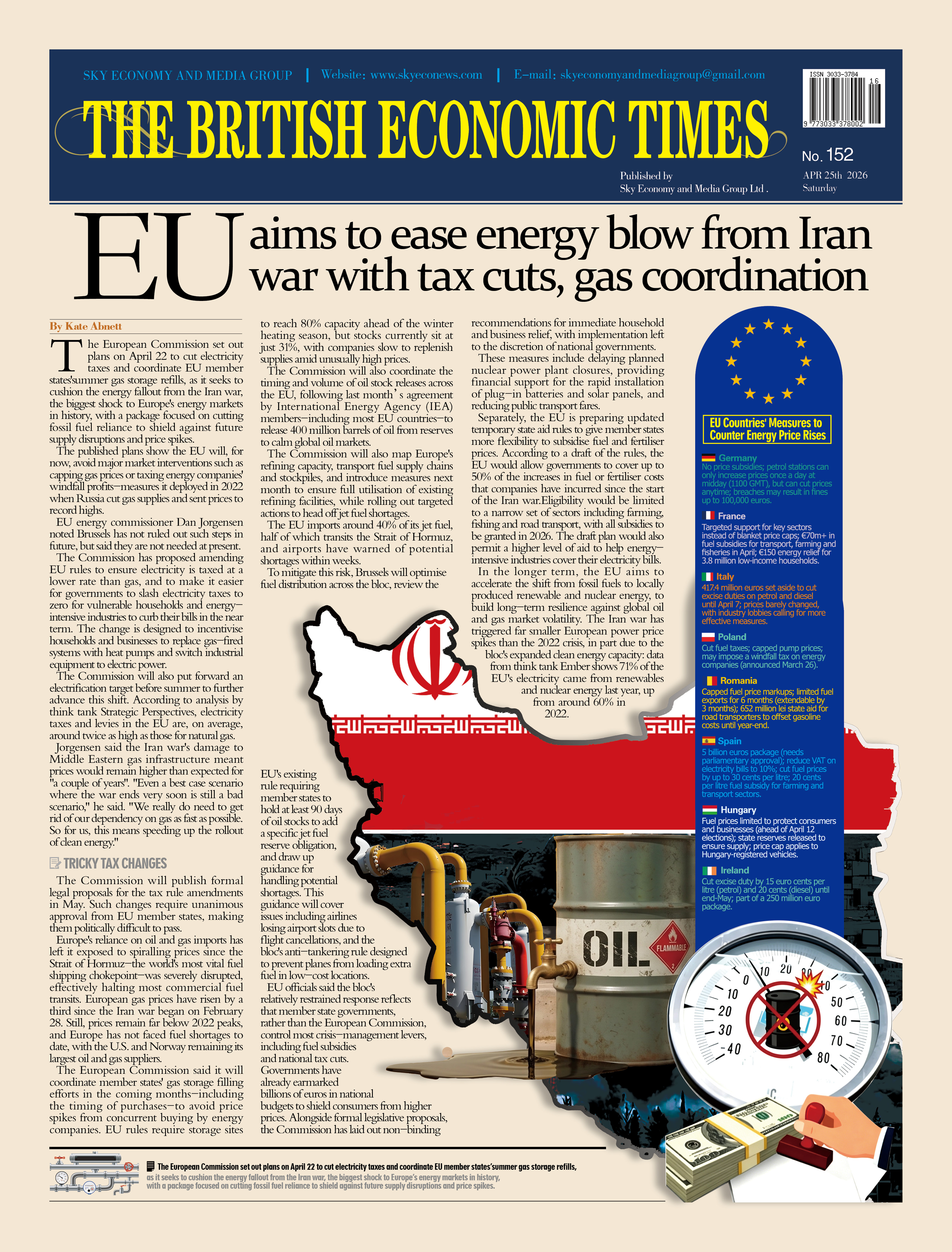 歐盟委員會週三公佈了一項計畫,擬削減電力稅並協調各國夏季天然氣儲氣工作,以期緩解伊朗戰爭帶來的能源衝...