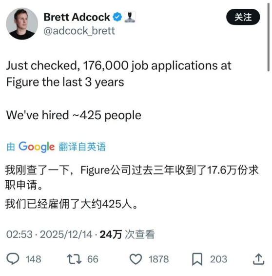 12月14日,Figure AI首席執行官佈雷特·阿德考克(Brett Adcock)在其個人社交平臺上公開表示,Figure AI自2022創立以來,收到過17.6萬份簡歷,其中只有約425人被錄用,錄用率為0.24%。若將申請數量平均分配到Figure AI運營的年份——每年接近5.9萬份申請,其錄取率低於美國最難考入的大學。根據《美國新聞與世界報導》排名,加州理工學院的錄取率最低,僅為3%。
