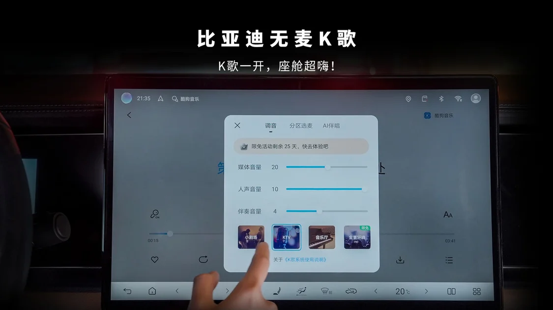 8 月 27 日消息,比亞迪今天宣佈,將在 8 月 OTA 更新中為全品牌車型陸續上線無麥 K 歌功能。