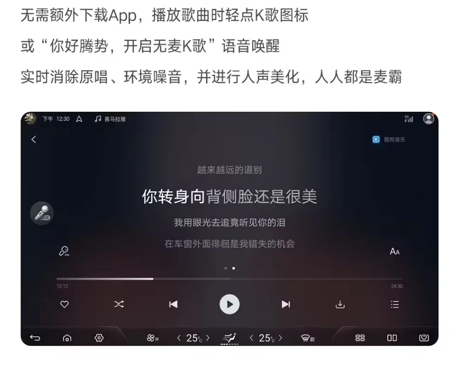 比亞迪、方程豹、騰勢、仰望品牌的車型都將獲得這項功能,支持酷狗音樂、酷我音樂、QQ 音樂、全民 K 歌軟體,車主可在播放音樂時點擊車機螢幕左側的麥克風圖示或直接使用語音助手啟用這項功能。