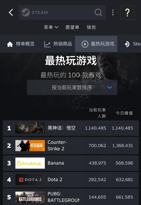 《黑神話:悟空》登頂Steam全球熱玩榜:線上玩家突破114萬