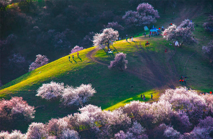 你且看伊犁河谷——蜿蜒的山坡披覆錦繡,層層疊疊的粉白自穀底漫卷山腰。風起時,花瓣簌簌飄落,遠處的牧人勒馬駐足。恍惚間,難辨是大地托起了雲霞,還是雲霞墜入了人間。