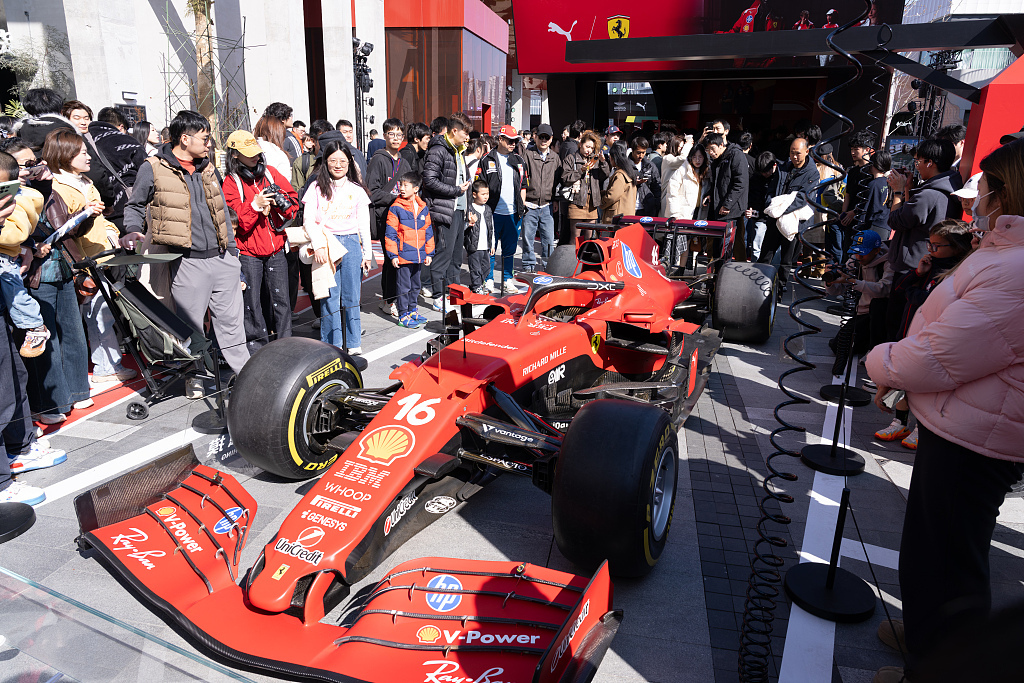 上海徐匯西岸濱江2026上海F1格子旗嘉年華,法拉利賽車展示。中國車迷歡聚一堂,與賽車合影。視覺中國 圖