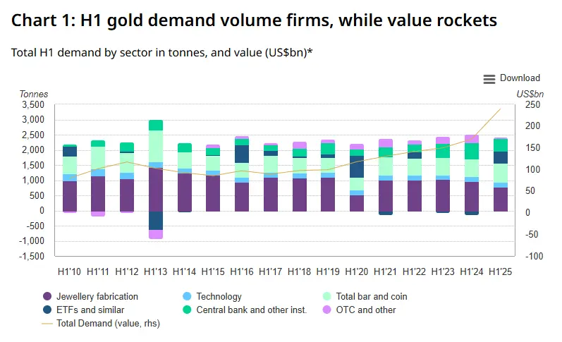 週四(7月31日),世界黃金協會(WGC)發佈報告稱,在今年第二季度,全球黃金總需求(含場外交易投資)同比增長3%至1249噸;若以美元計算則同比躍升45%,達到1320億美元。