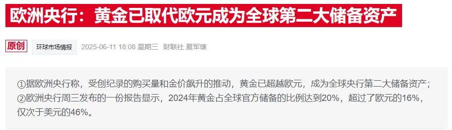 上月,歐洲央行發佈報告顯示,隨著金價屢創新高,按市場價格計算,去年黃金占全球外匯儲備的比例達到20%,超越歐元的16%位居第二,僅落後於占比46%的美元。