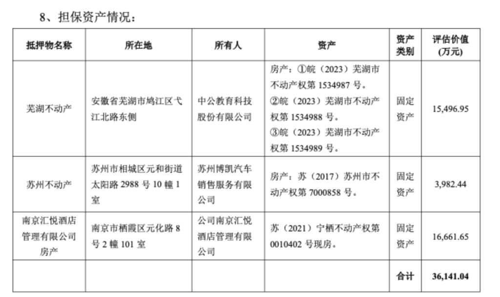 本次債務重組後,中信金資湖南分公司成為公司債權人;中公教育作為債務人、公司全資子公司湘潭中公未來科技有限公司作為共同債務人按約定向債權人中信金資湖南分公司履行還款義務。為確保上述債務重組順利進行,該公司及其全資子公司南京匯悅酒店管理有限公司、蘇州博凱汽車銷售服務有限公司以其名下自有資產為上述債務重組提供抵押擔保;公司全資子公司北京中公教育科技有限公司及公司控股股東李永新等相關方為上述債務重組提供保證擔保及質押擔保。