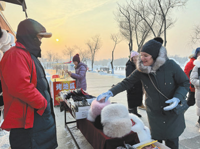 在參觀完太陽島國際雪雕藝術博覽會後,斯洛文尼亞駐華大使蘇嵐在攤販處選購帽子。