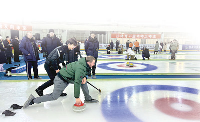在黑龍江省冰上訓練中心,駐華使節與青年運動員一起體驗冰壺運動。