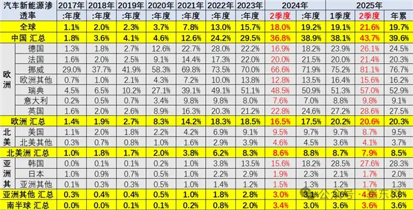在2025年最新滲透率數據中,各國發展極不均衡。中國新能源滲透率高達44%,德國達到26%,挪威更是達到81%,英國為29%,而美國僅有8.7%,日本僅2%。