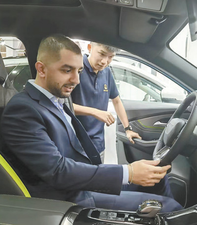 埃及首都開羅,熱鬧繁華的穆罕迪森區,阿拉伯國家聯盟大街上車水馬龍。走進一家汽車展銷店,一眾知名品牌汽車中,來自中國的新能源汽車格外引人注目。