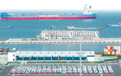 江蘇省太倉港國際集裝箱碼頭裝卸作業繁忙有序,新能源汽車正在準備裝船出口海外。