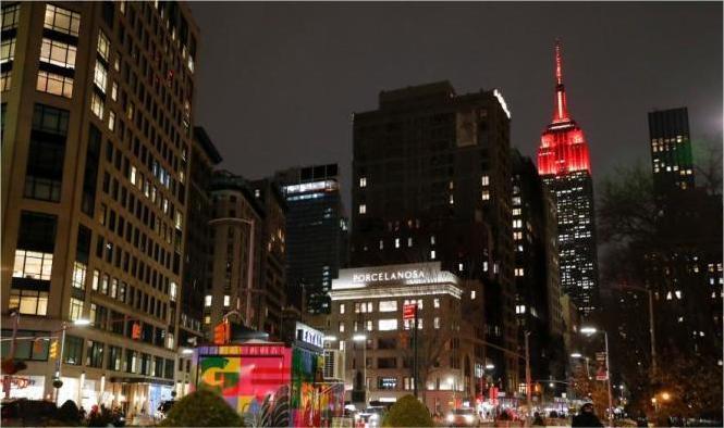資料圖:當地時間2021年2月10日,美國紐約帝國大廈為中國春節點亮紅色燈光。