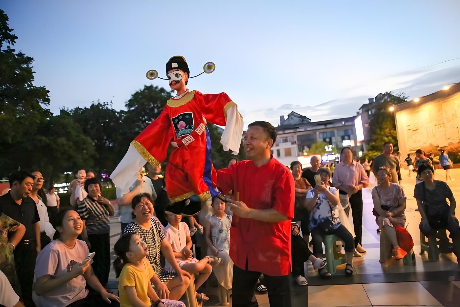 江蘇南通,如皋市如城街道安定廣場,由如城街道新時代文明實踐所舉行的非遺木偶“夜實踐”表演劇場,吸引眾多納涼的市民圍觀欣賞,近距離感受省級非遺杖頭木偶戲的操縱表演技藝。