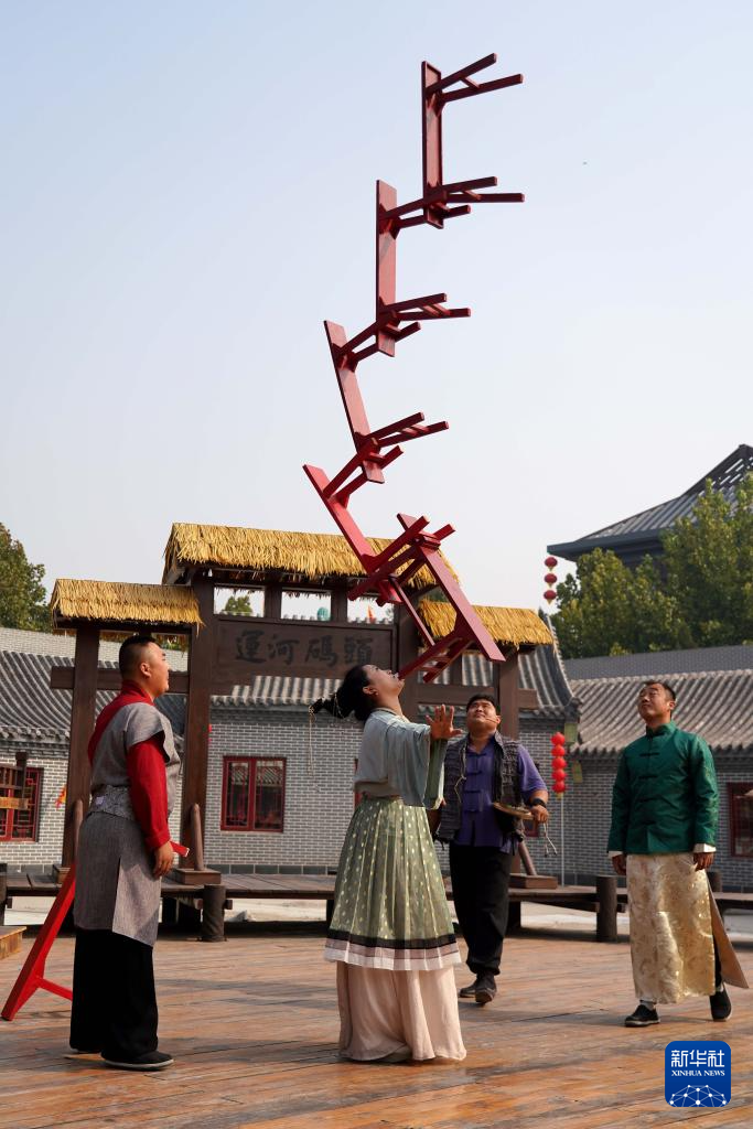 10月17日,雜技演員在吳橋雜技“九月廟會”上表演雜技節目。