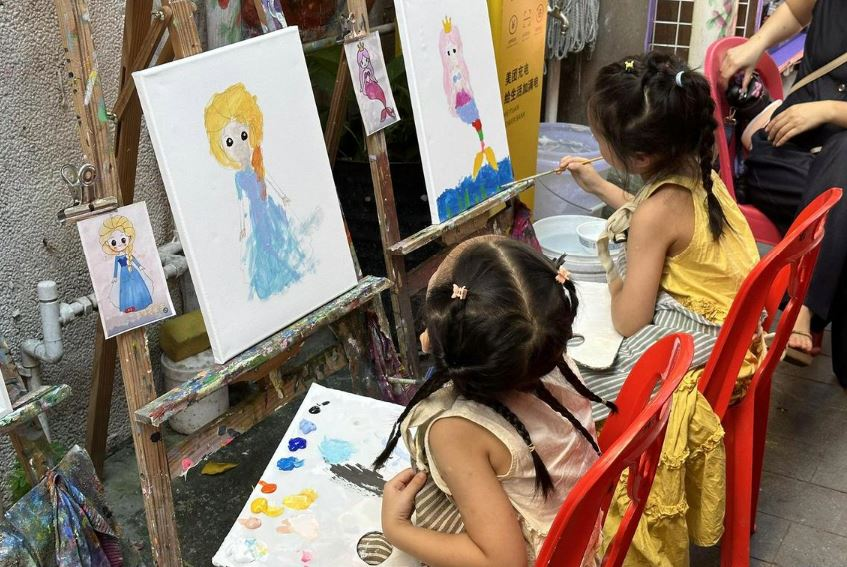 如今,走進大芬村,迎面而來的拉客聲不再是推銷油畫,更多是邀請遊客體驗油畫創作。在大芬村的大街小巷,畫架和座椅隨處可見。