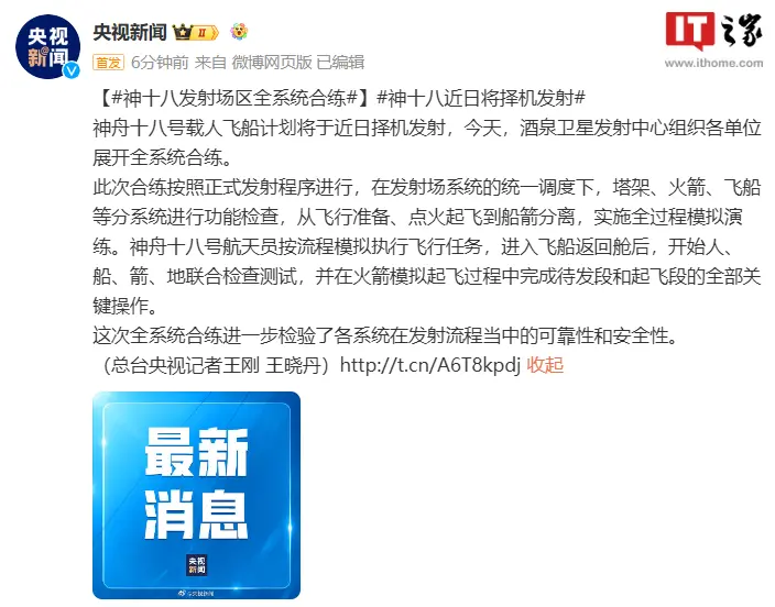 記者此前報導,根據任務安排,神舟十八號載人飛船將會在本月發射,目前神舟十八號船箭組合體已經在酒泉衛星發射中心完成垂直轉運,整裝待發。