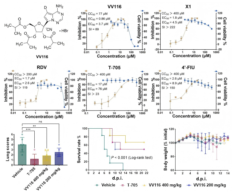 VV116(氫溴酸氘瑞米德韋片)是一種新型口服核苷類抗病毒藥物,已先後在烏茲別克斯坦和中國獲批上市用於新冠肺炎的治療。本研究發現,作為一種靶向病毒RNA依賴性RNA聚合酶(RdRp)的前藥,體外實驗中VV116和其代謝活性分子均展示了對尼帕病毒(包括馬來西亞株NiV-M和孟加拉株NiV-B)的顯著抑制活性。在金黃地鼠致死劑量感染模型中,VV116以400毫克每千克體重的口服給藥劑量下,能將實驗動物的存活率提高至66.7%,且顯著降低感染靶器官肺、脾和腦中的病毒載量。