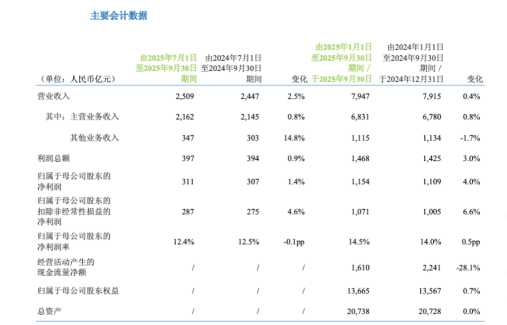 10月20日,中國移動(600941.SH,0941.HK)發佈的報告顯示,公司2025年前三季度營業收入為7947億元,同比增長0.4%,其中,主營業務(通信服務)收入為6831億元,同比增長0.8%,是營收增長的核心支柱;銷售產品收入及其他為1115億元,同比下降1.7%。歸屬於母公司股東的淨利潤為1154億元,同比增長4.0%,歸屬於母公司股東的淨利潤率為14.5%,同比增長0.5個百分點。