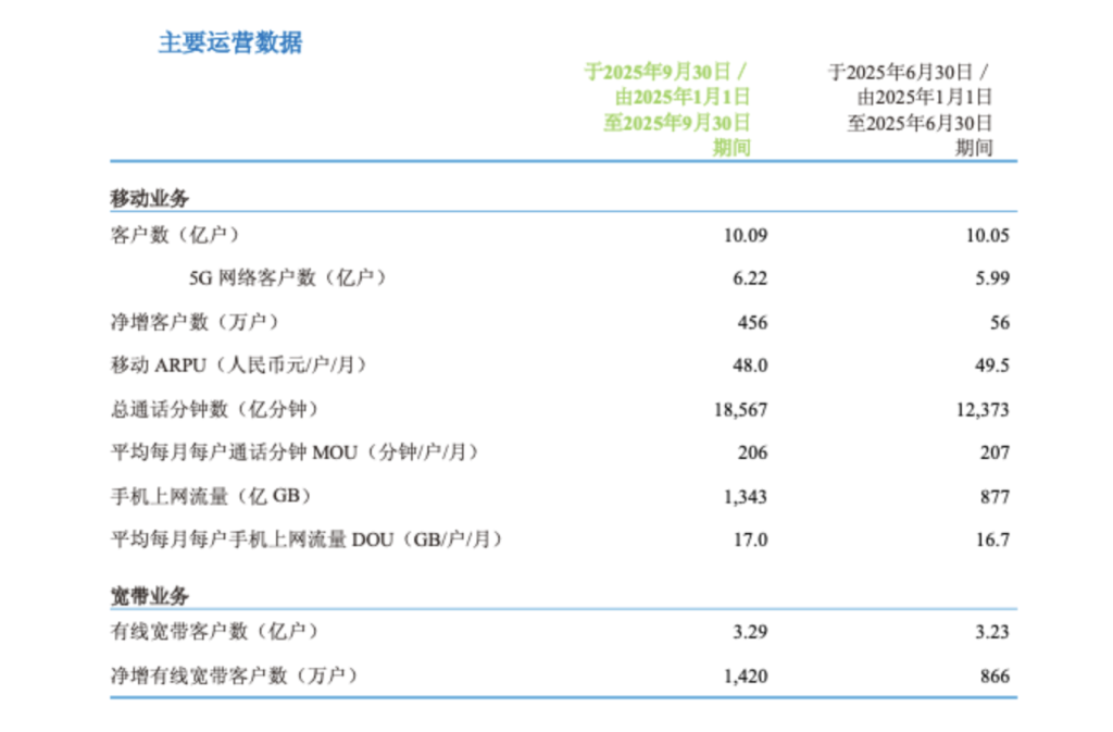 個人市場方面,截至2025年9月30日,移動客戶總數達10.09億戶,較2025年6月末淨增456萬戶;其中5G網路客戶數突破6.22億戶,較6月末淨增2300萬戶。前三季度手機上網流量同比增長8.3%,平均每月每戶手機上網流量(DOU)達17.0GB,同比增長8.1%;移動平均每月每用戶收入(ARPU)為48元。