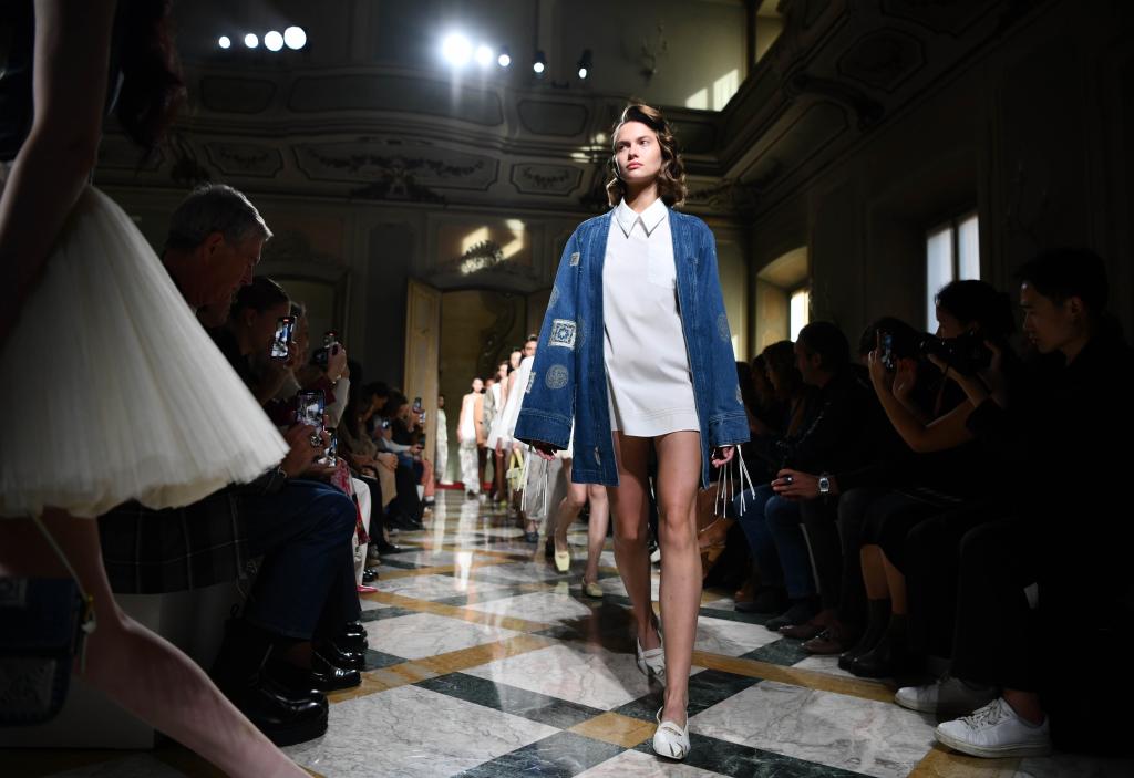 9月24日,模特在意大利米蘭時裝周上展示含有貴州苗繡元素的設計時裝。