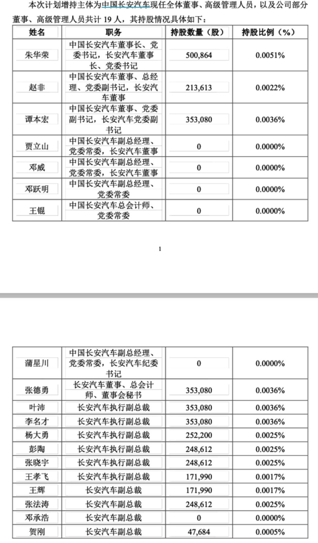 公告顯示,本次計畫增持主體為中國長安汽車現任全體董事、高級管理人員,以及公司部分董事、高級管理人員共計19人。