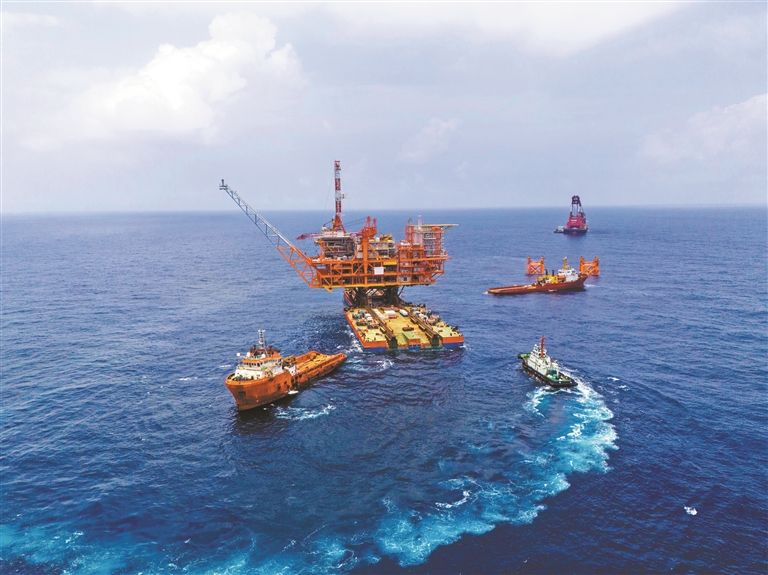 中國海油惠州26—6鑽采平臺上部組塊與導管架17日對接成功,完成海上安裝,這是中國首個智能海上鑽采平臺。