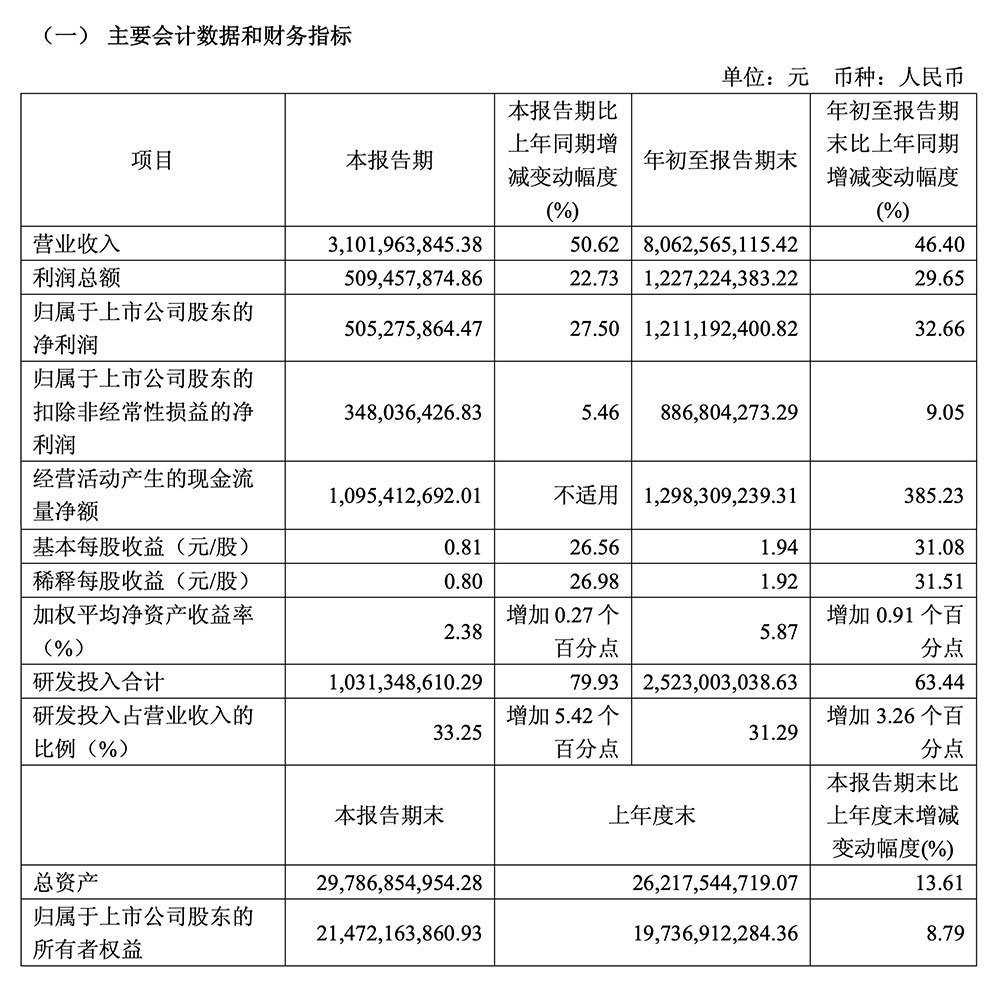 今年前三季度營業收入為80.63億元,同比增長約46.40%;淨利潤為12.11億元,同比增長了32.66%。前三季度研發投入為25.23億元,同比增長了63.44%,占營收比例為31.29%。