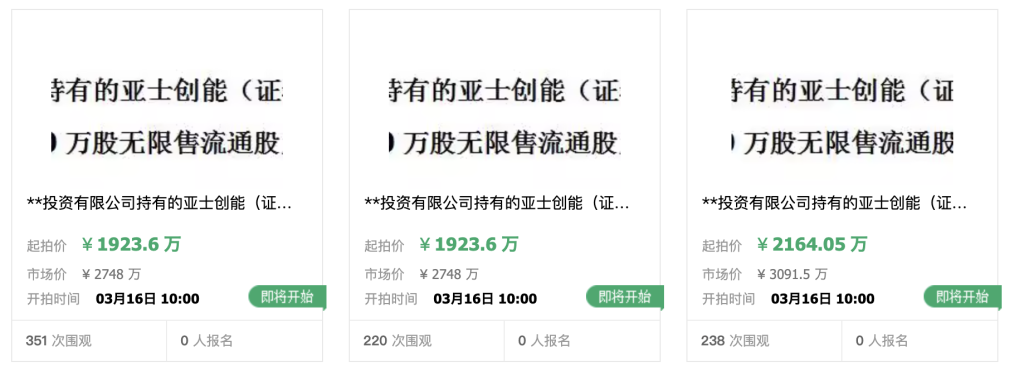 截至本公告披露日,創能明合計持有亞士創能7865.55萬股股份,占公司總股本的18.35%。亞士創能在公告中稱,本次拍賣事項不會影響公司的生產經營,也不會導致公司股權分佈不具備上市條件。