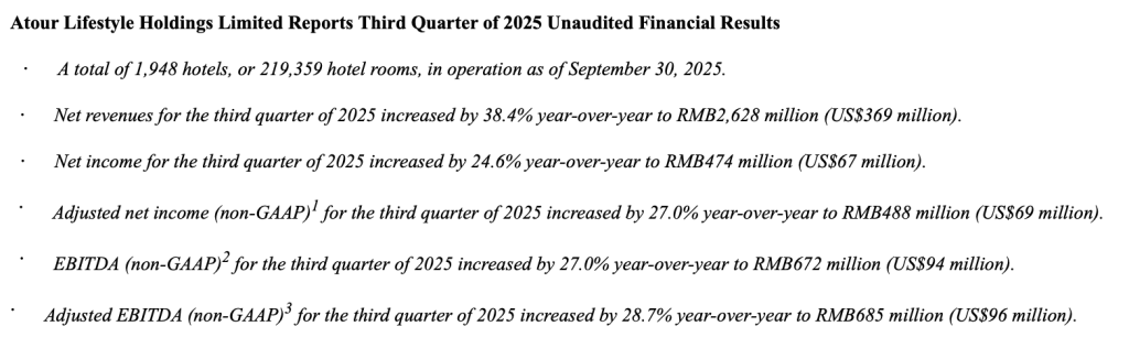 11月25日,中國連鎖酒店集團亞朵集團(Atour Lifestyle Holdings Limited,下稱“亞朵集團”,NASDAQ:ATAT)披露2025年第三季度業績報告。