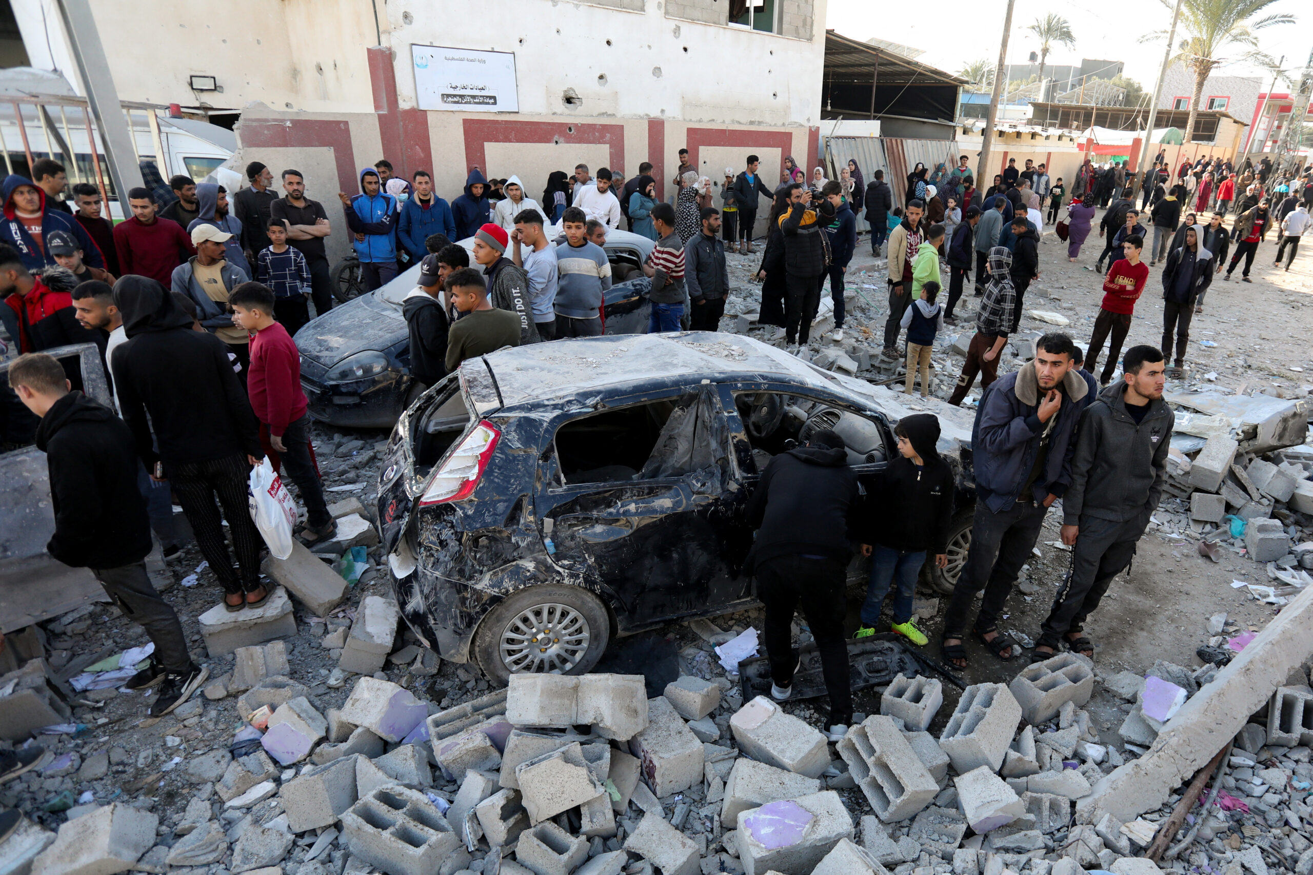 Palestinians gather next to a damaged vehicle as they inspect the site of an Israeli strike, amid the ongoing conflict between Israel and the Palestinian Islamist group Hamas, in Deir Al-Balah in the central Gaza Strip January 10, 2024. REUTERS/Mohammed Al-Masri