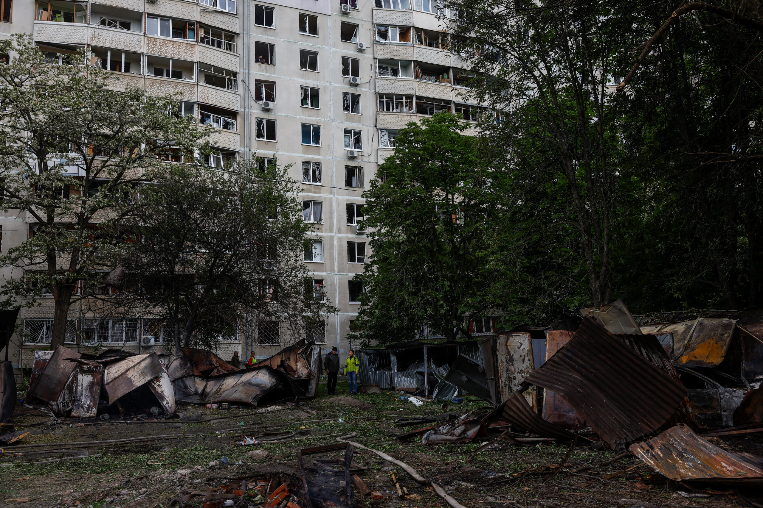 Local residents look at destroyed garages and cars at a site of a Russian air strike, amid Russia’s attack on Ukraine, in Kharkiv, Ukraine May 14, 2024. REUTERS/Valentyn Ogirenko
