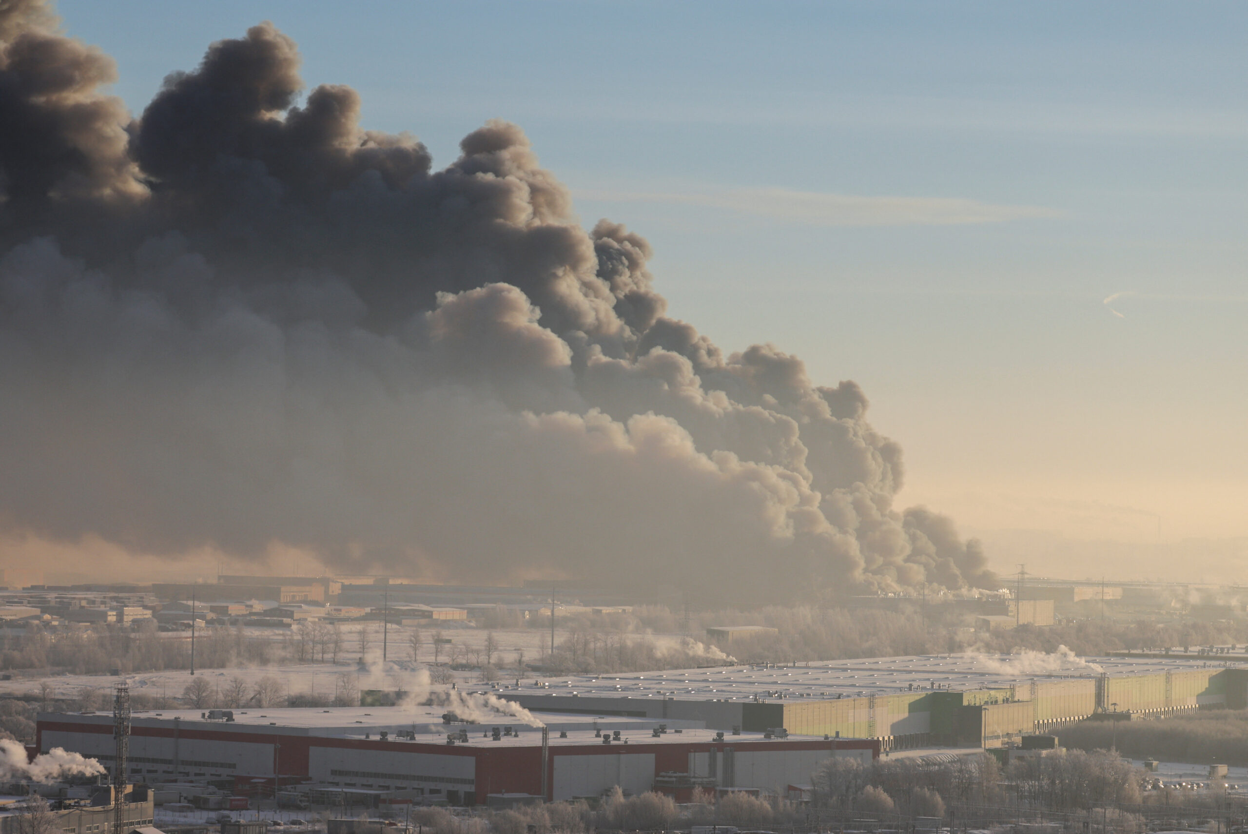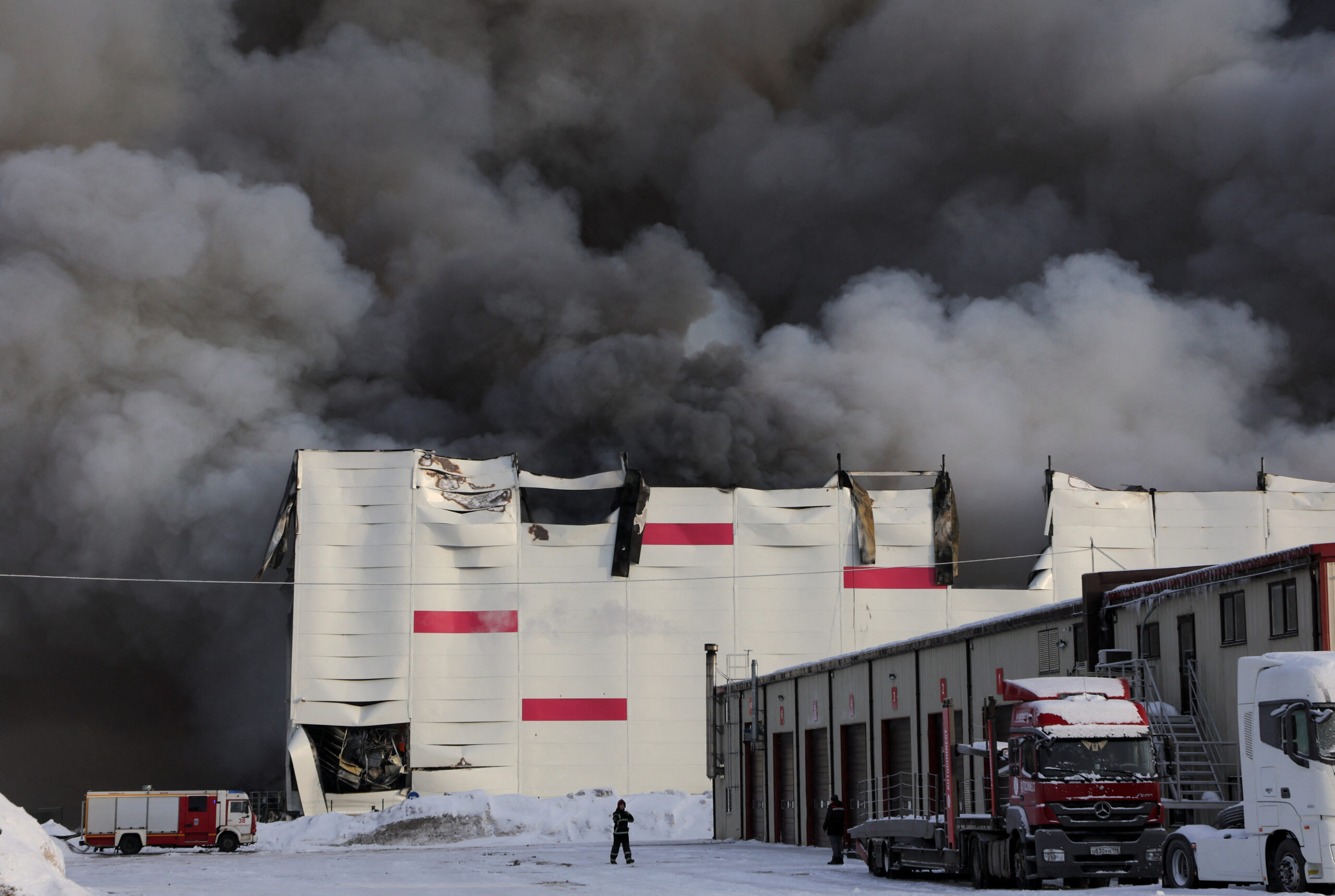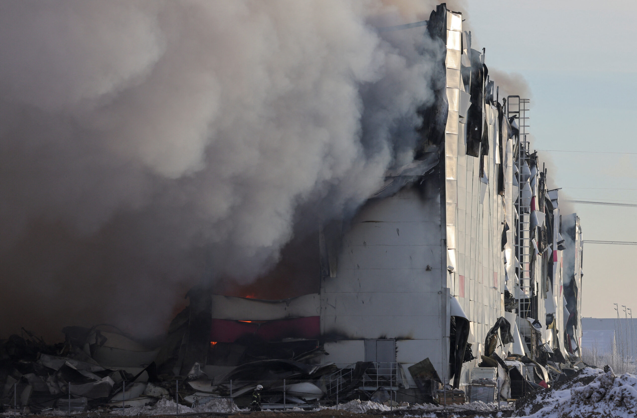 Smoke from fire rises above the burning warehouse of Wildberries online retailer in Saint Petersburg, Russia, January 13, 2024. REUTERS/Anton VaganovA firefighter works to put out fire at a warehouse of Wildberries online retailer in Saint Petersburg, Russia, January 13, 2024. REUTERS/Anton Vaganov