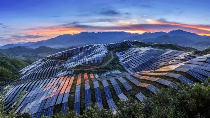 昆侖山下,中國青海省海西蒙古族藏族自治州格爾木市,占地近800畝的光伏基地內,藍色的光伏板集中成片,與遠處的雪山相互映襯。
