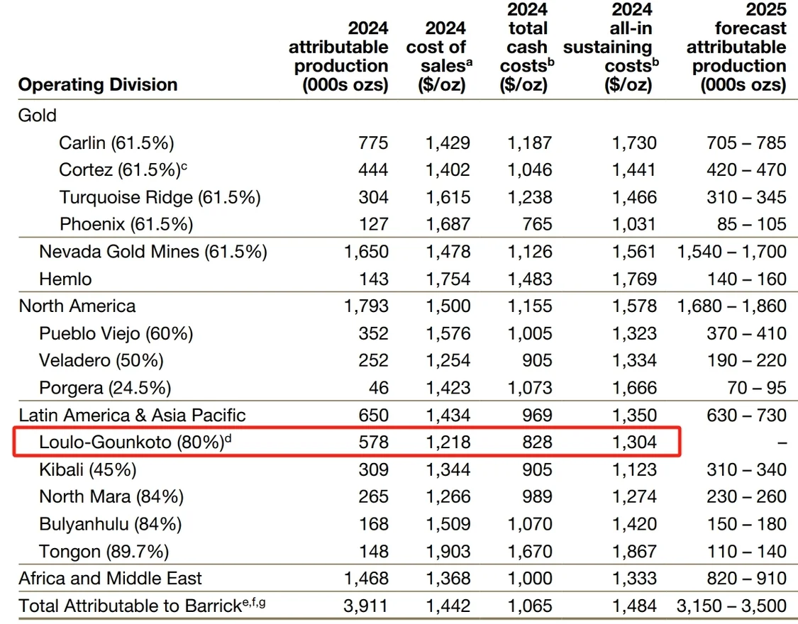 根據巴裏克2024財年年報,位列全球十大金礦的盧洛-貢科托礦區去年產能達到72.3萬盎司,按照股權比例(80%)計入57.8萬盎司的產能。