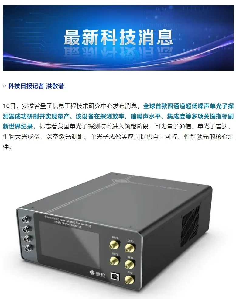 10 月 10 日消息,據科技日報今日報導,安徽省量子資訊工程技術研究中心發佈消息,全球首款四通道超低雜訊單光子探測器成功研製並實現量產。