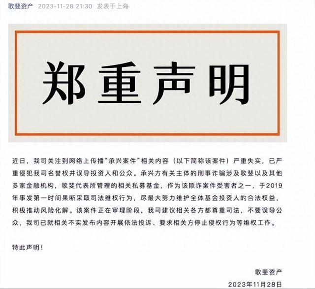 11月28日晚間9時許,諾亞系的歌斐資產通過微信公眾號發佈了《關於近期“承興案件”相關發佈失實的鄭重聲明》,開篇直言近日網路上傳播“承興案件”相關內容嚴重失實,已嚴重侵犯該司名譽權並誤導投資人和公眾。
