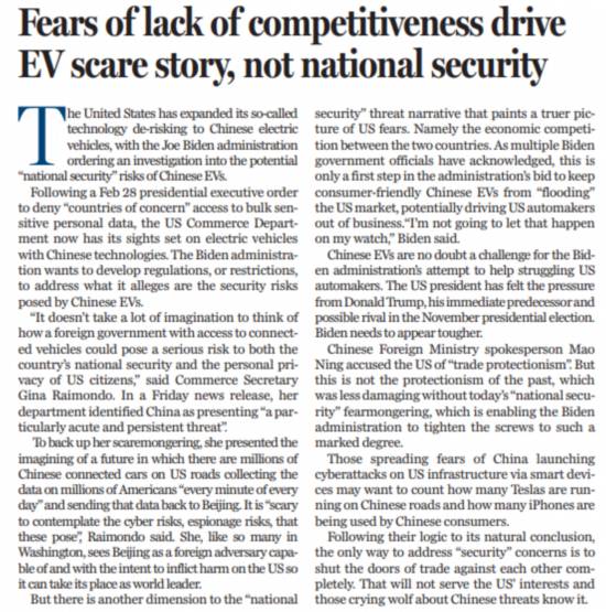 美國將技術方面的對華“去風險”擴大到電動汽車領域。近日,拜登政府以潛在的“國家安全”風險為由,下令對中國電動汽車展開調查。