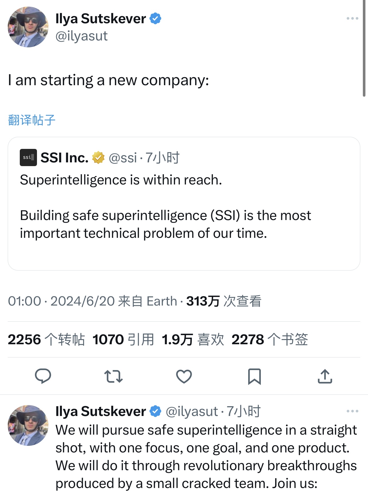 6月20日,OpenAI聯合創始人、前首席科學家伊爾亞·蘇茨克維(Ilya Sutskever)在社交平臺X上發文宣佈成立新公司SSI(safe superintelligence,安全超級智能)。