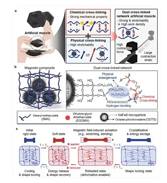 該“可變剛度”人造肌肉基於雙重交聯聚合物網路結構構建:化學鍵(共價鍵)提供材料的結構強度,而通過熱刺激可逆形成或斷裂的物理鍵則賦予材料在不同條件下調節剛度的能力。