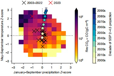 2003年至2023年期間火災排放量作為溫度和降水Z分數函數的變化情況顯示,在異常炎熱和乾燥的條件下,火災排放量大幅增加。這些炎熱乾燥的條件在2023年比前幾年更為普遍,解釋了為什麼2023年的火災排放量如此極端。