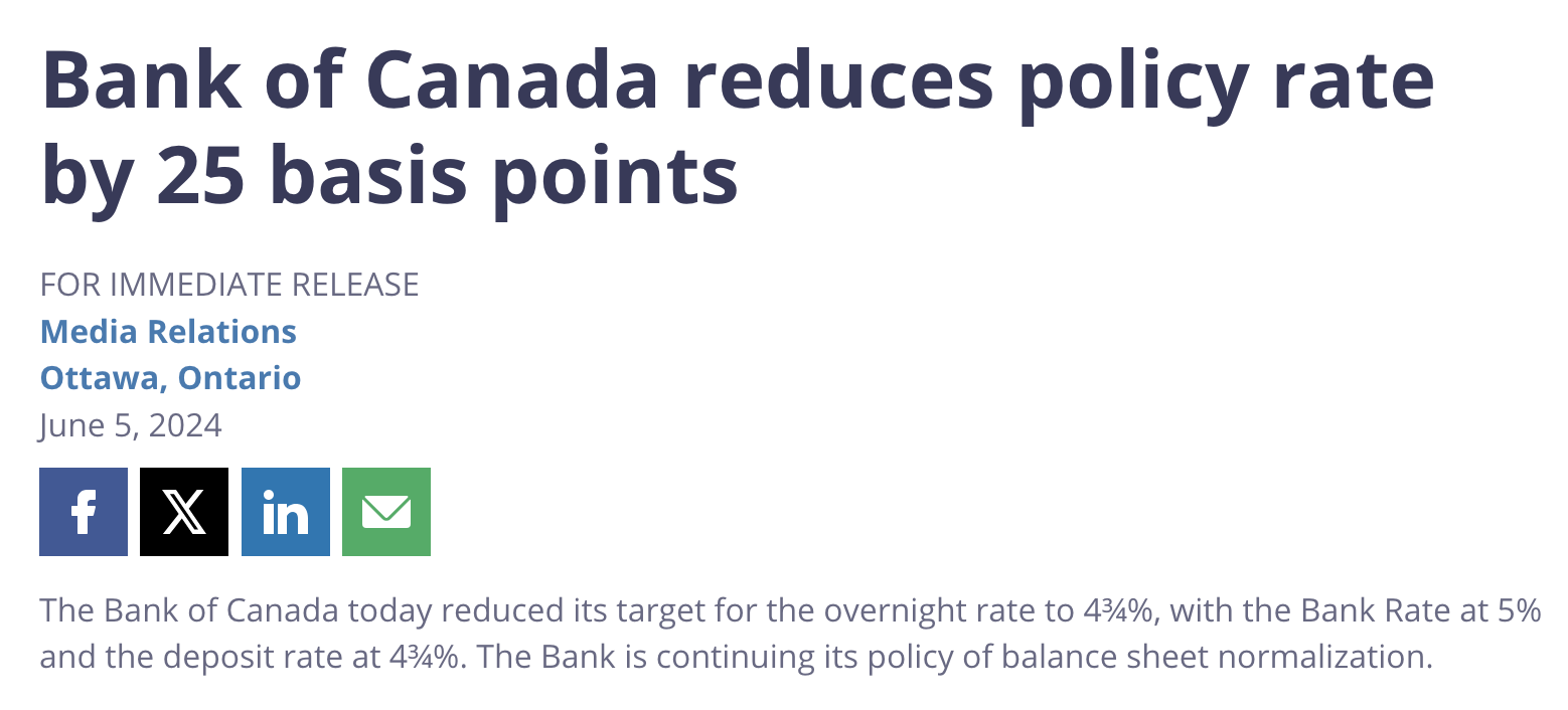 當地時間6月5日,加拿大央行在官網發佈利率決議,宣佈將隔夜利率目標從5%下調至4.75%,成為七國集團中首個在本輪抗通脹後放鬆貨幣政策的央行。