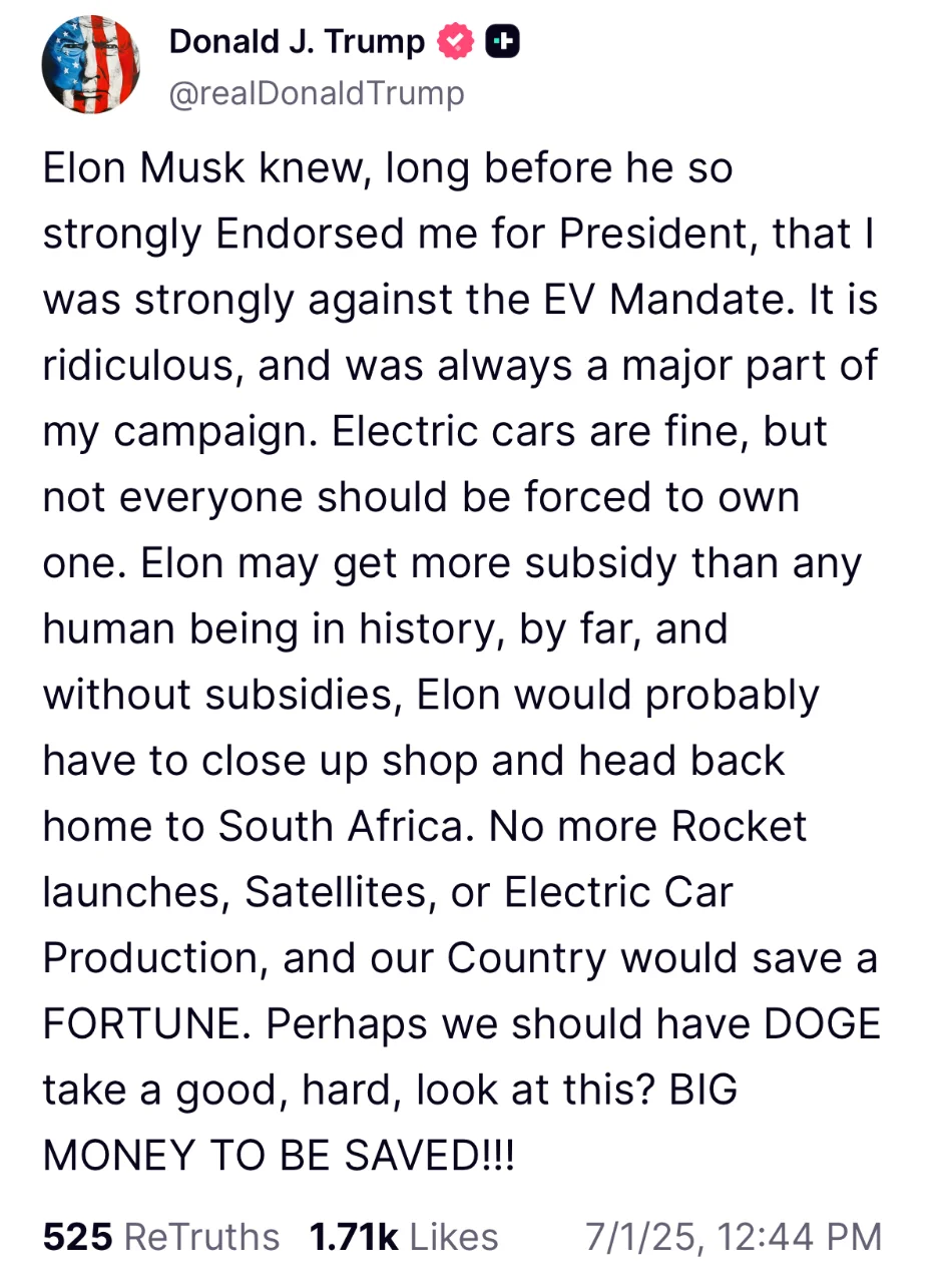特朗普在發文中毫不避諱地質疑馬斯克企業的生存能力。他宣稱:“馬斯克獲得的補貼可能比歷史上任何人都多,而且如果沒有補貼,他可能就得關門大吉,返回南非老家了。”
