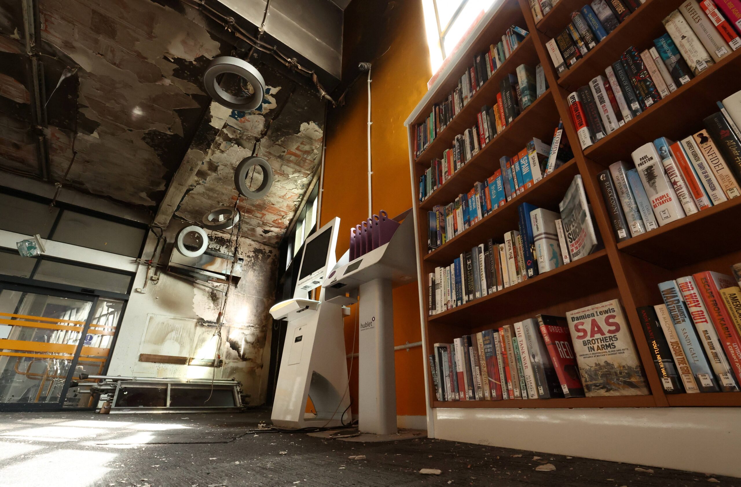 現在,圖書館(同時也是社區中心)的大部分地方都被熏黑,天花板上掛著燒焦的電線和燈具。
