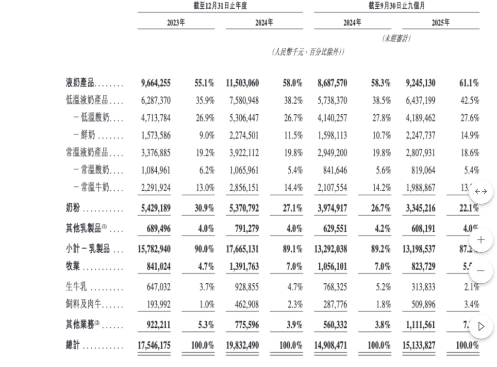 招股書顯示,君樂寶乳製品業務營收從2023年的157.83億元增至2024年的176.65億元,同比增長約11.9%,2025年前九個月收入131.99億元,同比2024年前九個月微降。近幾年,乳製品占總營收比例逐年降低,但比例仍維持在87%以上。