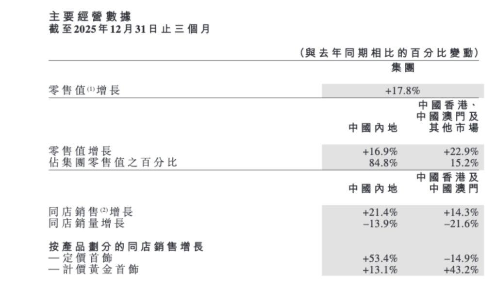 在中國香港、中國澳門及其他市場,則是計價黃金首飾貢獻值擴大,定價首飾貢獻值下降:定價首飾貢獻為29.8%(2025財年第三季度為39.4%),計價黃金首飾的貢獻為65.4%(2025財年第三季度為54.8%)。