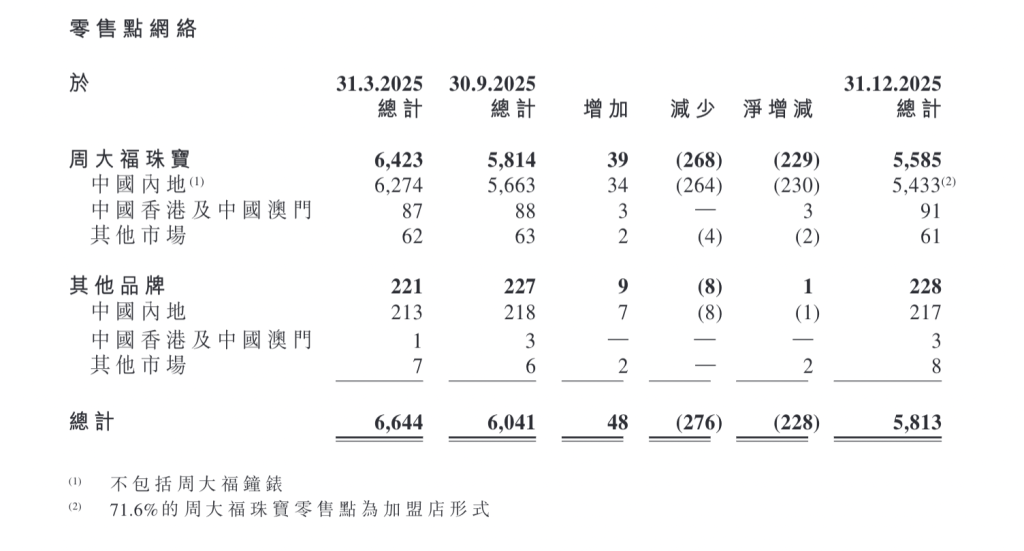 報告披露,周大福珠寶加盟店於季內對中國內地零售值的貢獻為66.2%,2025財政年度三季度的數值則為69.7%。
