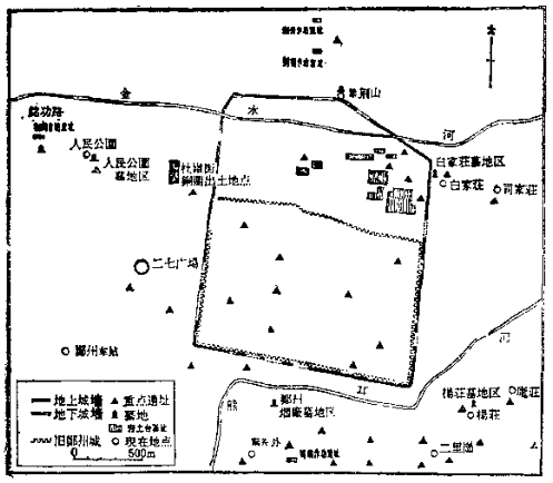 鄭州商城發現於1955年,後來又陸續發掘了疑似外城牆的夯土堆。整個鄭州商城的規模呈現接近方形,位於整個遺址的東北角,可見較為密集的夯土台基。有學者推測,此處應是鄭州商城的宮殿區。在鄭州商城的城垣週邊,有許多手工作坊遺址,有冶銅、制骨、制陶作坊等遺址的分佈。除此之外,城外四周也有墓葬群的分佈。