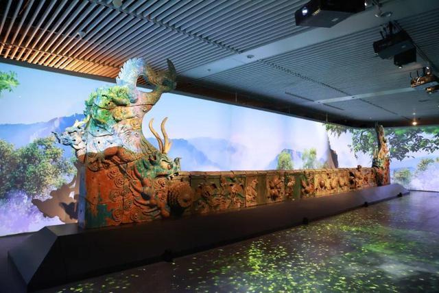 用數位化方式呈現文化遺產展示新範式。這件“三清殿琉璃正脊堆花脊身及東西鴟吻”被安置在5D數字空間內,觀眾結合實物和數字場景,沉浸式感受永樂宮的春夏秋冬。鴟吻紋樣考究、華麗精美,孔雀藍釉色歷經700年光亮如新,兼具實用性和美感,是中國古建築獨有的巧思。永樂宮殿頂的戧獸、套獸等都是釉面含鉛的琉璃,能阻擋水分對木結構的侵蝕,又能嚴密封固瓦壟。這件三清殿前簷當心間闌額,龍行花卉鏤雕圖案結合木雕和泥塑工藝,再現唐宋遺風。