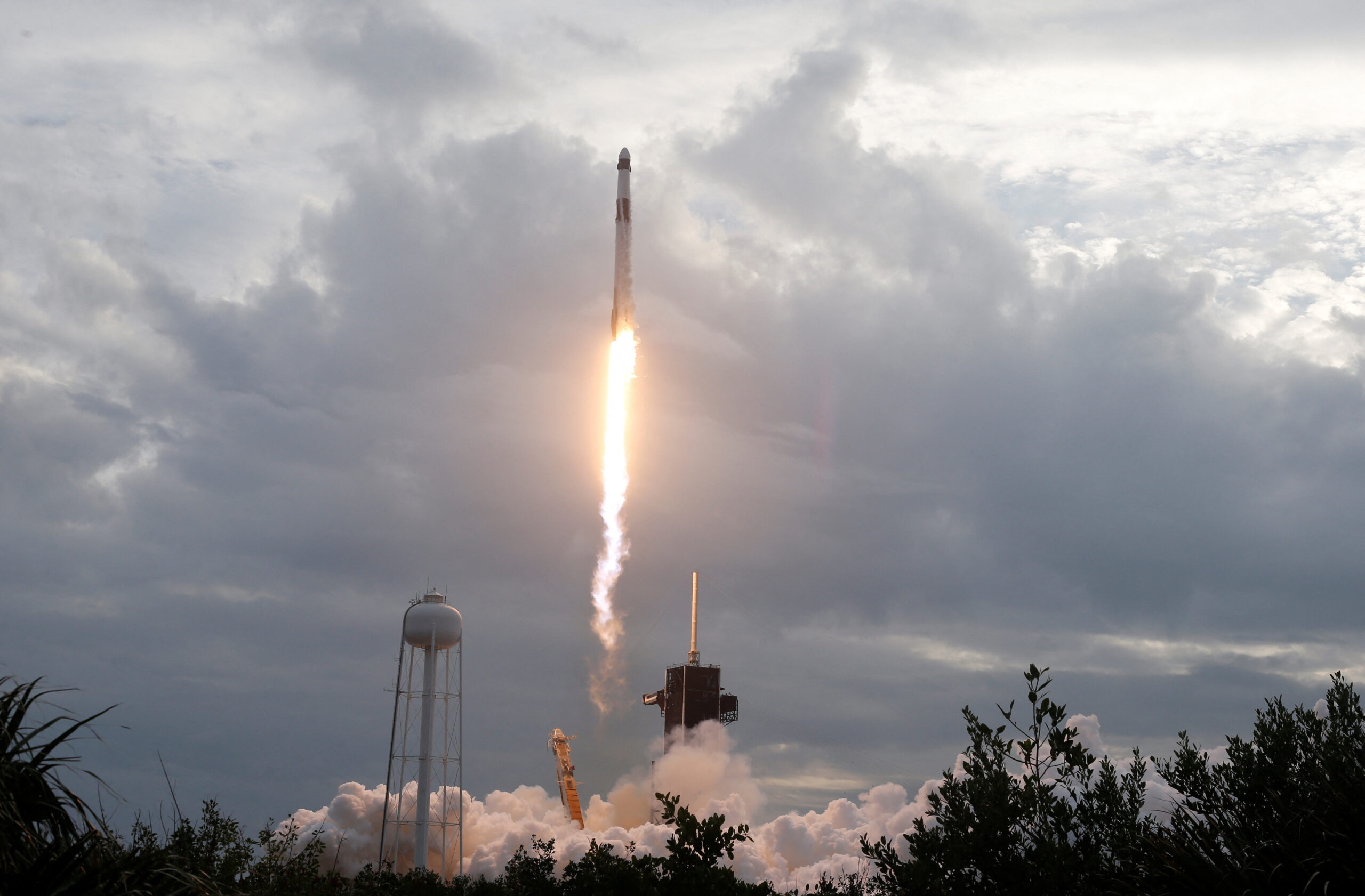 現場視頻顯示,兩級25層高的運載火箭在佛羅里達州大西洋沿岸多雲的天空中劃過,尾部拖著一條熾熱的黃色尾焰。