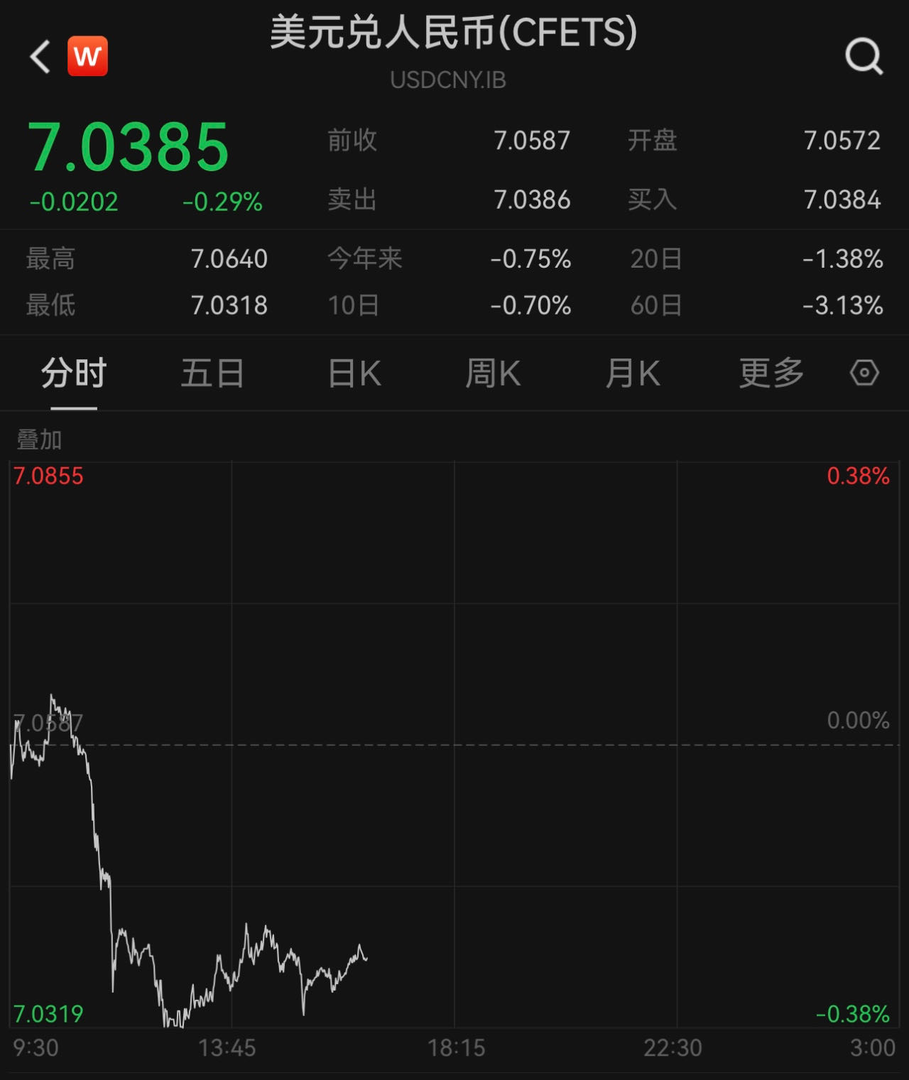 9月24日,人民幣對美元即期匯率盤中接連升破7.06、7.05、7.04關口,盤中最高升至7.0318,16時30分收盤報7.0385,較上一交易日漲202個基點,創下16個月以來的新高。